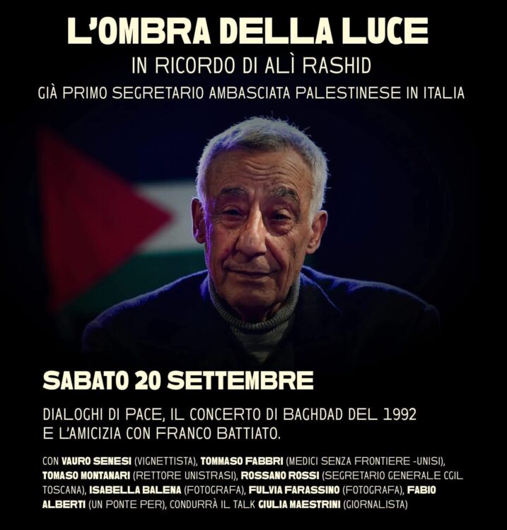 SIENA. Sabato 20 settembre, presso il Bastione San Domenico della Fortezza Medicea di Siena (ore 18), si terrà l’iniziativa “L’ombra della luce. In ricordo di Alì Rashid”, dedicata alla memoria di Alì Rashid, già primo segretario dell’Ambasciata Palestinese in Italia.