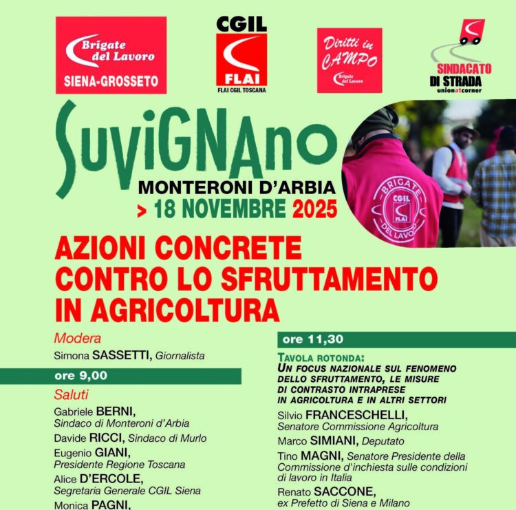 SUVIGNANO.  “Azioni concrete contro lo sfruttamento in agricoltura”, è questo il titolo e insieme il messaggio della giornata FLAI CGIL che avrà luogo il 18 Novembre alla Tenuta di Suvignano a Monteroni d’Arbia, bene confiscato alle mafie e oggi luogo di riscatto e legalità. L’iniziativa nasce a seguito della recente e intensa attività delle Brigate del Lavoro della Flai in provincia di Siena e Grosseto. Un’azione capillare del sindacato di strada, condotta anche all’alba, che ha reso possibile intercettare oltre 600 lavoratori agricoli direttamente nei luoghi di raccolta e davanti ai Centri di Accoglienza Straordinaria. L’attività del sindacato e i numerosi riscontri e verifiche portate avanti dalle autorità nei giorni successivi e uscite a mezzo stampa, hanno confermato che lo sfruttamento lavorativo in agricoltura non è un fenomeno marginale, ma un sistema molto radicato che attraversa i territori e segna le vite di centinaia di lavoratori e lavoratrici migranti.