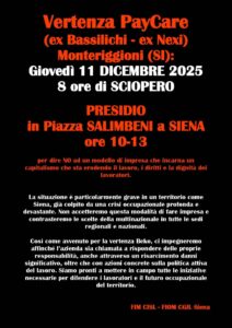 MONTERIGGIONI. Le organizzazioni sindacali FIM CISL e FIOM CGIL proclamano 8 ore di sciopero per il giorno 11 dicembre, con presidio in Piazza Salimbeni a Siena dalle ore 10 alle ore 13, per dire NO ad un modello di impresa che incarna un capitalismo che sta erodendo il lavoro, i diritti e la dignità dei lavoratori.