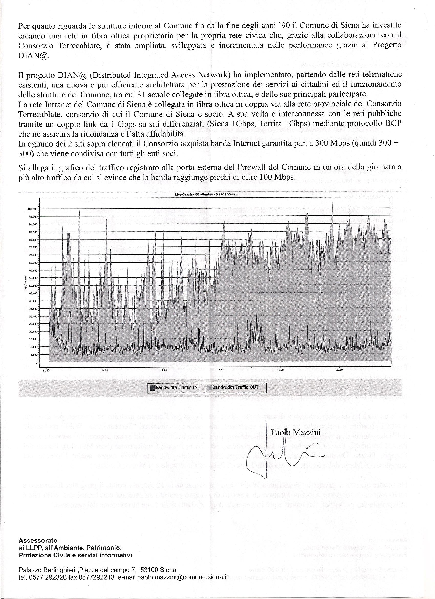 SIENA. Una lunga lettera, quella firmata dall’assessore Paolo Mazzini, contenente una serie di informazioni più o meno interessanti, ma che non risponde assolutamente all’unico quesito posto nell’interrogazione, e cioè: “quale posto occupa attualmente il Comune di Siena, a livello nazionale, quanto a velocità di connessione ad internet”?