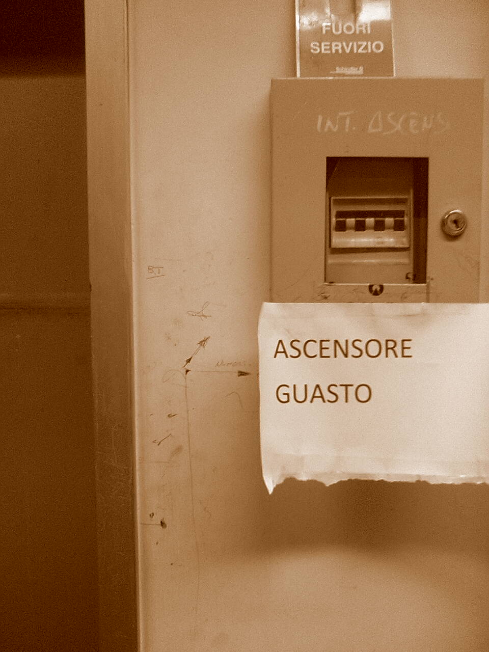 2) L’ascensore è fuori servizio da quasi cinque mesi (Foto 12) perché, si sente dire, deve arrivare un pezzo di ricambio: trattasi senz’altro di un gioiello tecnologico futuribile prodotto in una galassia lontana milioni di anni luce. In compenso arrivano puntuali tutti i giorni le imprecazioni e i commenti sarcastici contro il Monte dei poveri clienti costretti, sani o malati, giovani o vecchi che siano, a farsi le scale fino al secondo piano.