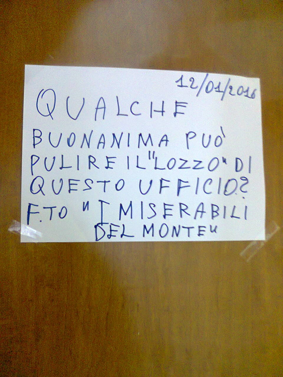 Dopo essermi stato impedito per un lungo periodo di tempo – per scelta aziendale – di svolgere una qualsiasi mansione lavorativa, dopo aver ricevuto fin dal mio ingresso nel mondo Monte Paschi schede valutative con micro punteggi palesemente pretestuosi (come puntualmente dimostrato nei vari ricorsi) e dopo aver subito la comminazione di tre sanzioni disciplinari per il “delitto di lesa maestà” del Monte per aver osato esprimere liberamente il mio pensiero sul Cittadino online, ecco che mi tocca convivere giorno dopo giorno, con il sudicio dell’ufficio che non si riesce, inspiegabilmente, ad eliminare.