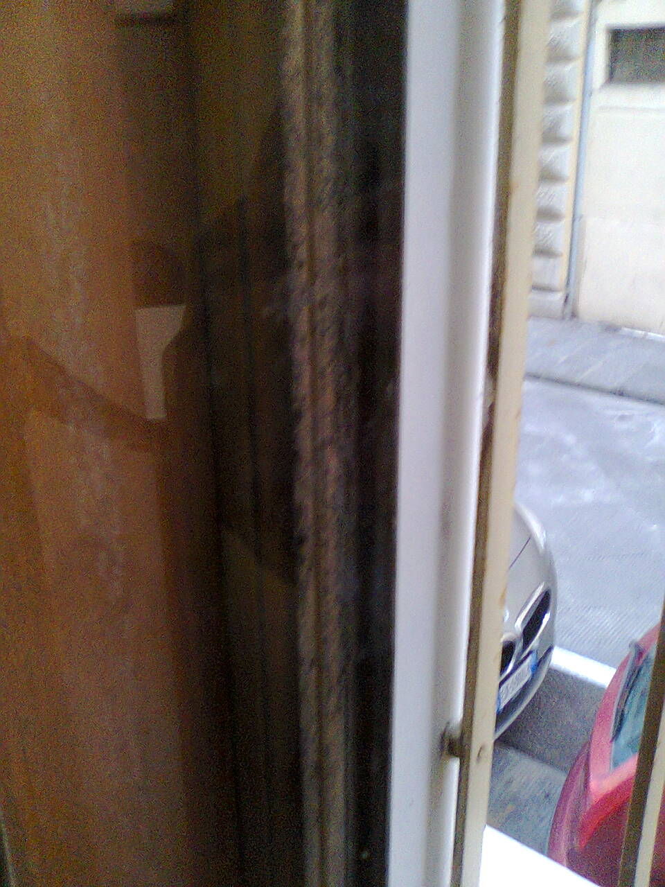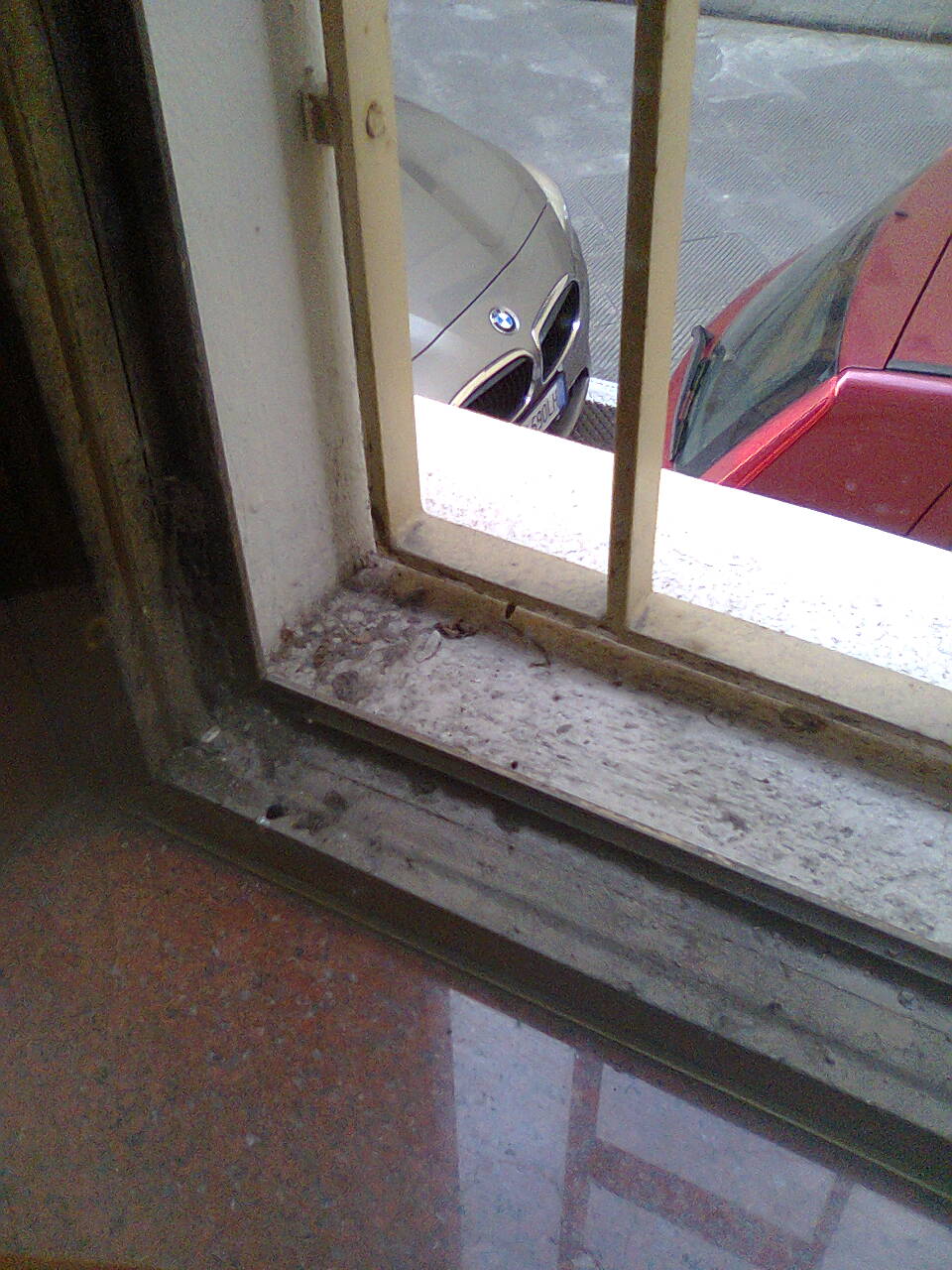 Morale della favola? Dal 9 dicembre 2015 e quindi dalla bellezza di 75 giorni io sono costretto a lavorare con alle spalle tende che si presentano così (Foto 3-4) e con un finestrone ridotto in questo stato (Foto 5-6-7-8-9), senza che l’azienda muova un dito. Dico, è possibile che quello che una volta era il terzo gruppo bancario del Paese faccia lavorare un suo lavoratore in un locale con vista discarica? Per togliere quel sudiciume devo forse chiamare il 115?