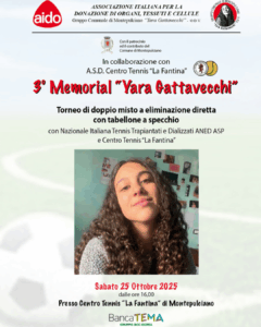 MONTEPULCIANO. Il prossimo sabato 25 ottobre a Montepulciano si terrà il “3° Memorial Yara Gattavecchi”, un evento sportivo promosso da AIDO Montepulciano per sensibilizzare sull’importanza della donazione degli organi. Il memorial, dedicato alla giovane poliziana tragicamente scomparsa nell’agosto 2021, quest’anno si svolgerà sui campi da tennis con un torneo di doppio misto a eliminazione diretta, con tabellone a specchio, che vedrà la partecipazione della Nazionale Italiana Tennis Trapiantati e Dializzati ANED ASP. Il torneo inizierà alle 16:00 presso Centro Tennis “La Fantina” di Montepulciano ed è a ingresso gratuito. L’inizio di ogni partita sarà affidato simbolicamente a cittadini di Montepulciano trapiantati.