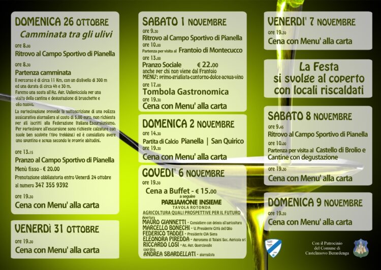 La Camminata tra gli Olivi apre così il programma della Festa dell’Olio Novo di Pianella, in programma 26 e 31 ottobre, 1 e 2 novembre e dal 6 al 9 novembre 2025, organizzata dal Gruppo Sportivo Dilettantistico Pianella con il patrocinio del Comune di Castelnuovo Berardenga.