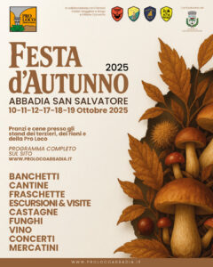 ABBADIA SAN SALVATORE. Abbadia San Salvatore si prepara ad accogliere uno degli appuntamenti più attesi dell’anno: la Festa d’Autunno, in programma nei due weekend del 10-12 ottobre e 17-19 ottobre 2025.