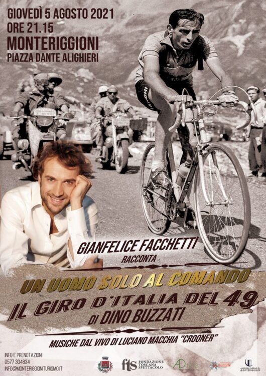 Giovedì 5 agosto avrà luogo un appuntamento unico in Toscana; lo splendido spettacolo “Dino Buzzati al Giro d’Italia” di Gianfelice Facchetti, con musiche dal vivo di Luciano Macchia “Crooner”, oltre a tante immagini e video. E’ il 1949 quando Dino Buzzati viene inviato dal “Corriere della Sera” al seguito del 32° Giro d’Italia. Ha il compito di fare il “colore”, come si dice in gergo giornalistico, affiancandosi a Ciro Verratti, inviato del “Corriere d’Informazione”, cui è invece affidata la cronaca. Attraverso la sua penna la competizione più amata e seguita dal Paese si trasforma in un’epopea classica, dove il duello tra il “vecchio” Gino Bartali e il “giovane” Fausto Coppi gli riporta alla mente quello omerico tra Ettore e Achille.