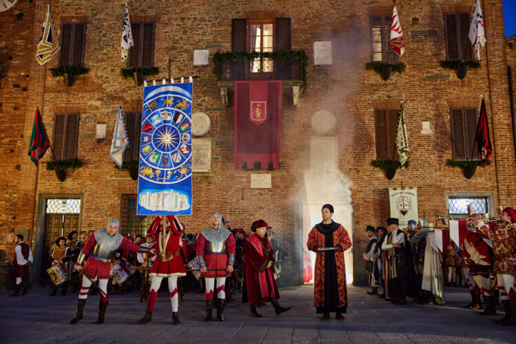 L’estrazione è stata seguita dalla presentazione del palio dipinto dall’artista Cristiana Margutti, umbra di nascita e torritese di adozione. Il drappo, unico nel suo stile, raffigura i segni zodiacali che coprono il cielo di Torrita durante i mesi di preparazione al Palio. Il palio sarà esposto fino al giorno della benedizione nella stanza del corteo storico in Via Ottavio Maestri. Un modo per tenere vivo il desiderio di vittoria dei contradaioli, i quali, camminando per le vie del paese, sapranno che sin dal primo giorno il premio da conquistare è lì pronto ad aspettarli.