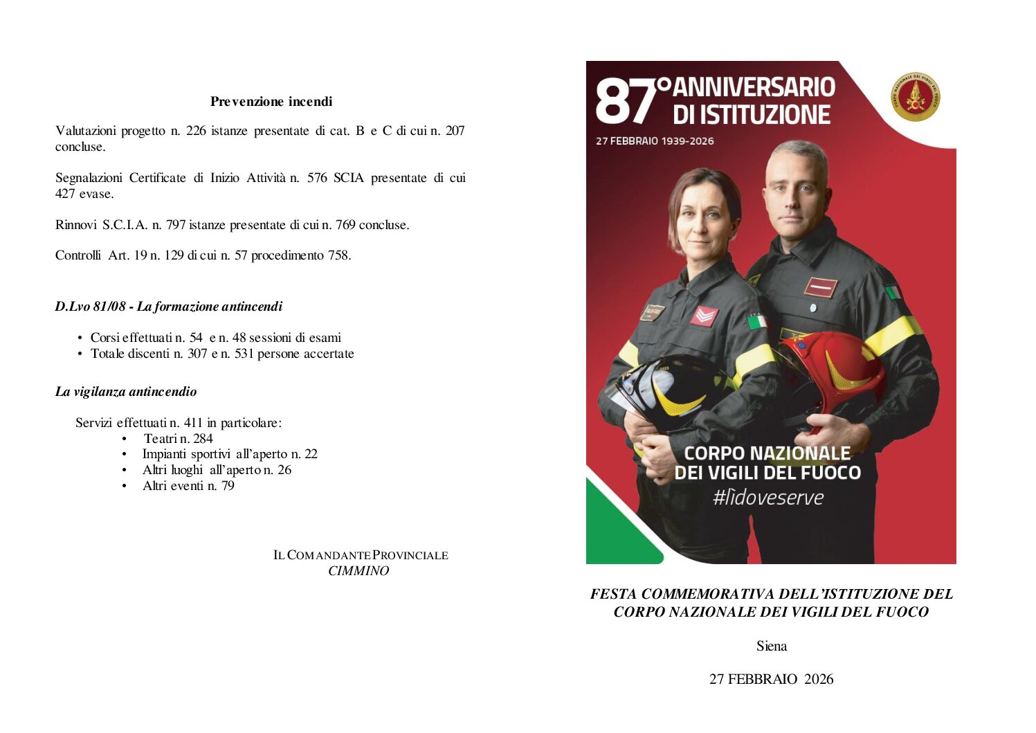 SIENA. Prima edizione della festa per l’istituzione del corpo nazionale dei Vigili del fuoco, attivo da 87 anni e celebrato con lo slogan “Lì dove serve”, a sottolineare il ruolo nel soccorso tecnico: l’appuntamento è per venerdì 27 febbraio, quando 87 anni fa con Regio Decreto 333 venne istituito il Corpo Nazionale dei Vigili del Fuoco.