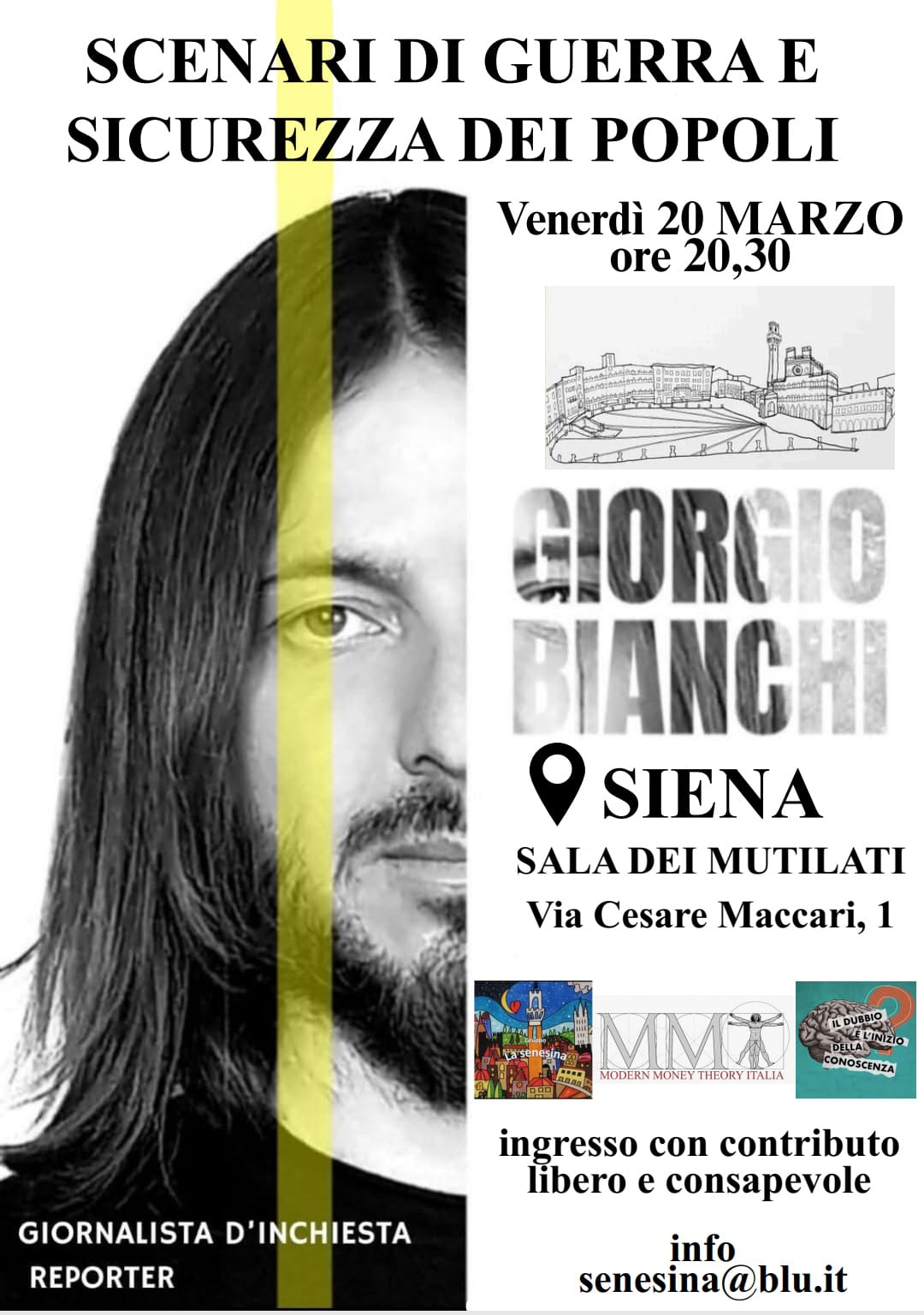 L’iniziativa, organizzata dai gruppi La Senesina, Il Comitato il Dubbio e l’ Associazione MMT Italia vedrà come protagonista il fotoreporter Giorgio Bianchi, documentarista e videomaker italiano, noto per i suoi reportage in zone di conflitto, in particolare in Ucraina (Donbass). Attivo come reporter indipendente su YouTube e social media ha lavorato in Siria, Burkina Faso, Vietnam, Myanmar, Nepal, India ed Europa. Freelance con focus politico e antropologico, grazie alle sue esperienze sul campo analizzerà e fornirà una lettura geopolitica dell’attuale situazione internazionale attraverso un excursus generale al fine di comprendere la complessità dei presupposti politici internazionali e le correlazioni con la politica, finanza, sicurezza sociale e sanitaria.