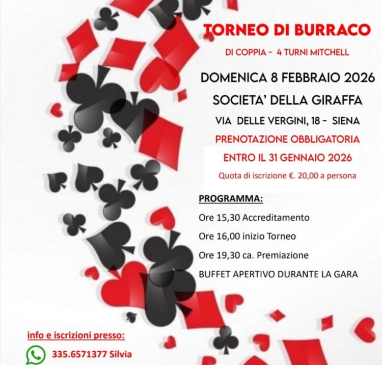 SIENA. Un torneo di Burraco per raccogliere fondi per l’Eremo di Lecceto. Ancora una volta dunque è stato raccolto l’appello “Restaura lo scrigno, custodisci il tesoro! Aiutaci a custodire il tesoro comune della presenza agostiniana a Lecceto” rivolto dalle monache a tutta la cittadinanza senese per poter mettere in sicurezza l’ala est dell’edificio, bisognosa di importanti lavori di consolidamento per contrastarne il dissesto. Dopo un primo finanziamento da parte della Fondazione Monte dei Paschi, tanti i benefattori che stanno contribuendo a raccogliere la consistente somma necessaria. Ora a scendere in campo è il Rotary Siena Est che organizza un torneo di Burraco (a coppie – 4 turni mitchell), aperto a tutti i senesi appassionati di questo gioco, il cui ricavato sarà devoluto per finanziare i lavori. L’appuntamento è per domenica 8 febbraio nei locali della società della contrada della Giraffa, in via delle Vergini 18, alle ore 15,30 per l’accreditamento, con inizio gara alle 16 (buffet aperitivo durante il suo svolgimento): la premiazione è prevista intorno alle 19,30. Obbligatoria la prenotazione entro il 31 gennaio prossimo. La quota di iscrizione è di 20 euro a persona. Informazioni e iscrizioni al 3356571377.