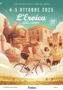 Il poster per L’Eroica 2025 celebra l’anima poliedrica dell’evento: il ciclismo d’altri tempi, vissuto tra strade bianche e sudore, insieme alla scoperta del Chianti e dei suoi paesaggi iconici. I protagonisti appaiono come eroi di un racconto epico, sospesi tra storia e leggenda, tra nuvole di polvere e sguardi tesi all’orizzonte. Attorno a loro scorrono borghi, colline e scene di convivialità, in un mosaico che unisce sport, cultura e territorio. La composizione richiama lo spirito di un film western, ma con i toni caldi e accoglienti della Toscana, rinnovando il racconto di un’impresa collettiva e senza tempo.