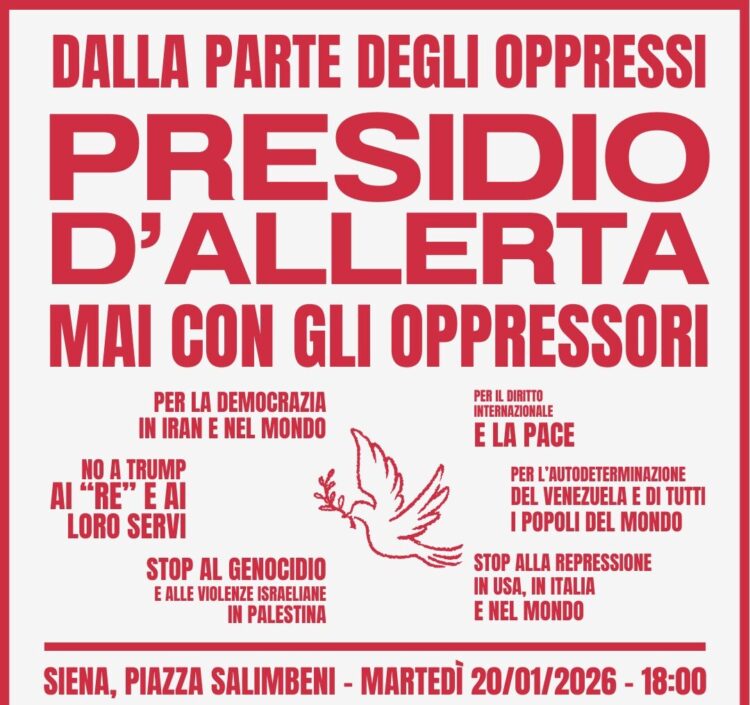 Per queste ragioni, contro ogni violazione del diritto internazionale e di autodeterminazione dei popoli, contro ogni forma di repressione del dissenso, per un equilibrio di pace mondiale in cui non trovino cittadinanza i “re” che si contendono l’impero economico e finanziario del mondo con la legge della forza e delle bombe, e la difesa della democrazia e delle libertà, invitiamo le forze politiche e associative e la cittadinanza tutta a manifestare con noi martedì 20 gennaio alle ore 18 in Piazza Salimbeni.