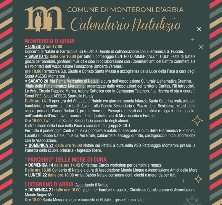 “Questo cartellone è il risultato della collegialità e del lavoro di squadra di tutta l’amministrazione comunale – commenta il sindaco di Monteroni d’Arbia Gabriele Berni – Abbiamo realizzato un programma ricchissimo, pensato per ogni fascia d’età e per tutti le frazioni, affinché il paese viva pienamente lo spirito del Natale. Il comune ha lavorato con la volontà precisa di creare occasioni di incontro, di condivisione e di crescita sociale. Anche quest’anno l’amministrazione insieme alle associazioni ha voluto costruire, coinvolgendo tutte le frazioni del territorio, un Natale diffuso, capace di includere tutto il tessuto urbano e di generare partecipazione e vitalità in ogni area. Siamo convinti che una programmazione ampia e inclusiva, sostenuta da eventi gratuiti e di qualità, possa contribuire a rafforzare il senso di appartenenza e a valorizzare le nostre eccellenze culturali, artistiche e commerciali.”
