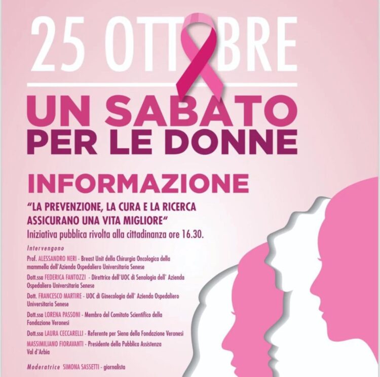 Oltre all’attività di screening sabato 25 ottobre alle 16:30 sempre alla sede della Pubblica Assistenza si terrà un incontro informativo, moderato dalla giornalista Simona Sassetti ed aperto a tutti i cittadini, sul tema della prevenzione dal titolo “La prevenzione, la Cura e la Ricerca assicurano una vita migliore”. Un’occasione per discutere di prevenzione e sensibilizzare tutti coloro che possono essere colpiti dalla malattia insieme a medici dell’Azienda ospedaliero universitaria senese ed esperti della Fondazione Veronesi, poiché un cancro individuato precocemente ha il 90% di possibilità di guarire entro cinque anni.