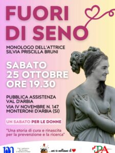 Successivamente, alle ore 19, ci sarà il monologo dell’attrice Silvia Priscilla Bruni “Fuori di Seno”, una performance, che punta a far riflettere con il sorriso sull’importanza della prevenzione, con la testimonianza diretta di chi ha sofferto di questa malattia, seguito da un apericena per tutti i partecipanti.