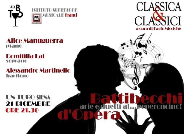 Una notte con il tubo. Il dopo cena di mercoledì 21 dicembre si “scalderà” a partire dalle ore 21.30 con la serata Classica&Classici, dal titolo ‘Battibecchi d’opera: arie e duetti al peperoncino’, a cura di Paolo Miccichè, proposta dal Tubo nel Vicolo del Luparello, in collaborazione con l’Istituto Rinaldo Franci. Per l’occasione due dei migliori allievi cantanti di Laura Poverelli: Domitilla Lai, soprano e Alessandro Martinello, baritono, accompagnati al pianoforte da Alice Manuguerra, ci guideranno nel viaggio in note alla scoperta dell’opera.