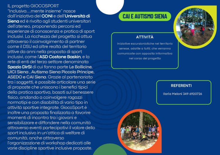 SIENA. Il progetto GIOCOSPORT “Inclusiva….mente insieme” è una iniziativa del CONI e dell’Università di Siena rivolta agli studenti universitari dell’ateneo, proponendo percorsi ed esperienze di conoscenza e pratica di sport inclusivi e coinvolge per la promozione partner come il DSU Toscana ed altre realtà del territorio attive da anni nella proposta di sport inclusivi, come l’ASD Costone Baskin, e la rete di enti del terzo settore denominata Spazio DirSI di cui fanno parte le associazioni Le Bollicine, UICI Siena , Autismo Siena Piccolo Principe, ASEDO e CAI Siena.