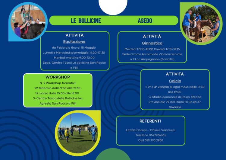 Il prossimo appuntamento è con il workshop formativo per le attività di equitazione organizzato dall’Associazione “Le Bollicine”. Il 22 febbraio dalle 9,30 alle 12,30 presso la località Agresto – Centro Le Bollicine a San Rocco a Pilli.