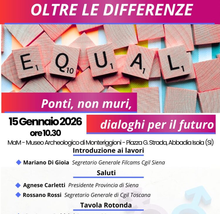 “L’evento riunirà figure istituzionali e della politica nazionale con rappresentanti del mondo sindacale, per discutere concretamente di come costruire ponti anziché muri, di come trasformare il dialogo in azione, di come passare dalle parole ai fatti nella promozione della parità, – prosegue la sigla – dopo l’introduzione ai lavori di Mariano Di Gioia, Segretario Generale FILCAMS CGIL Siena, porteranno i loro saluti Agnese Carletti, Presidente della Provincia di Siena, e Rossano Rossi, Segretario Generale della CGIL Toscana. Seguirà una tavola rotonda con la partecipazione dell’On. Laura Boldrini (deputata PD), dell’On. Elisabetta Piccolotti (deputata AVS), dell’On. Chiara Appendino (deputata M5S), dell’Avvocata Marina Capponi (CPO Avvocati di Firenze – Cons. INAF e UNIFI) e di Alice D’Ercole (Segretaria Generale CGIL Siena). I lavori saranno coordinati da Chiara Brilli, direttrice editoriale di Controradio”.