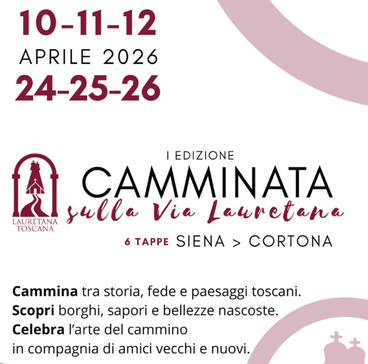 SIENA. Scatta domani, venerdì 10 aprile 2026, alle 14.30, col ritrovo dei partecipanti al “Flat white” del Bar della Stazione di Siena (con deposito bagagli a tariffa convenzionata e coupon di sconto sulle consumazioni) la tappa inaugurale della “Camminata sulla Via Lauretana” da Siena a Cortona, che si svolgerà nei weekend del 10-12 e del 24-26/4 lungo il percorso etrusco-romano, medievale e rinascimentale (dal 2020 Cammino ufficiale della Regione Toscana) tra la Città del Palio e Loreto.