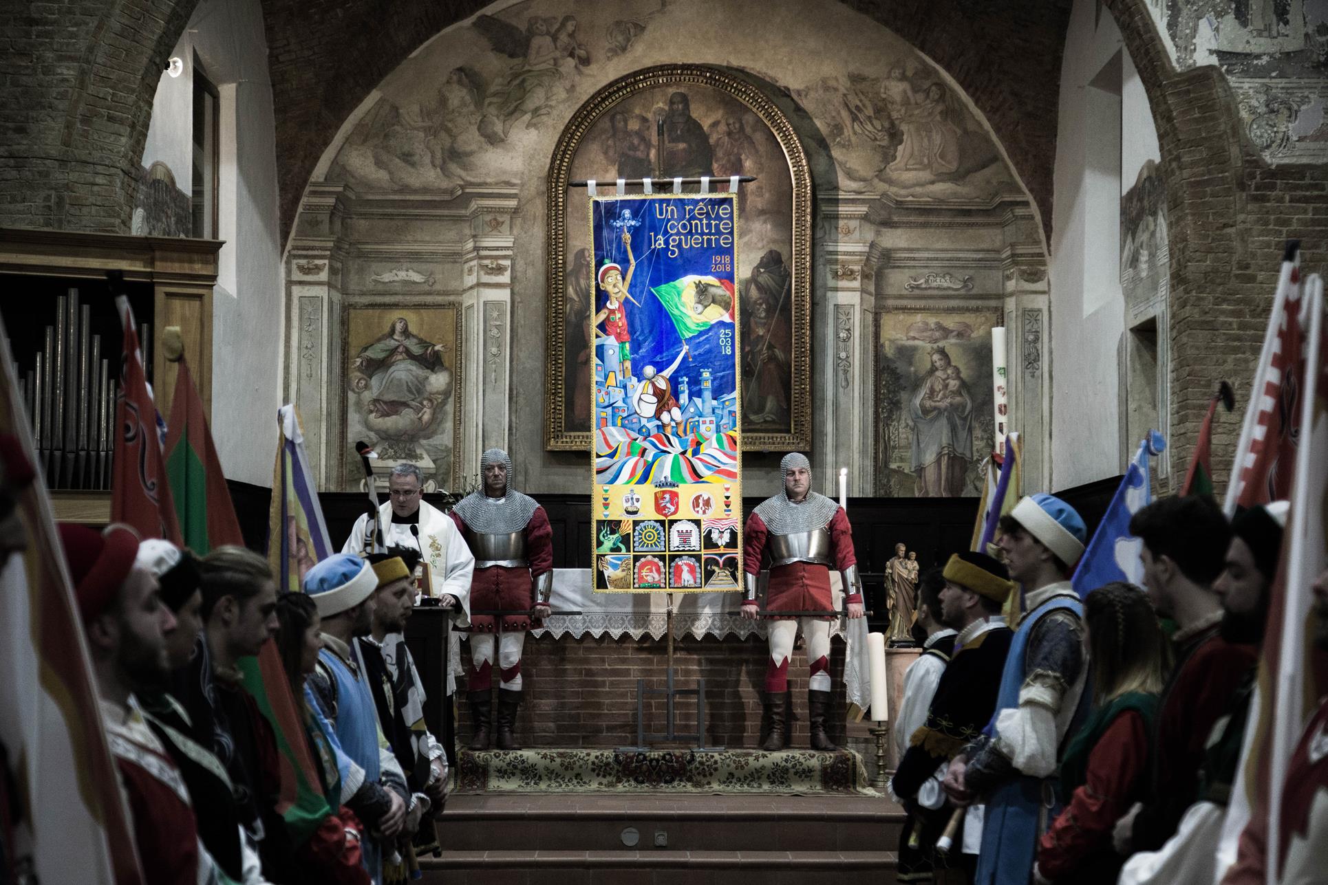 L’affluenza di spettatori è stata cospicua fin dalla mattina quando il Vescovo Stefano Manetti ha officiato la benedizione delle Palme e poi la Messa alla quale hanno assistito le comparse delle otto contrade. Sotto un bel sole, di stampo finalmente primaverile, si è poi mosso l’elegante corteo storico, con oltre 200 figuranti, che ha attraversato tutto il centro storico. Particolarmente apprezzato il ruolo della banda del Palio che, oltre a scandire i momenti del cerimoniale e ad attribuire solennità ai vari movimenti, ha proposto i nuovi inni delle contrade, composti dal Maestro Mirko Rubegni ispirandosi ad alcuni grandi classici.