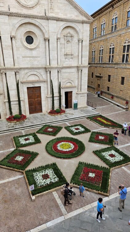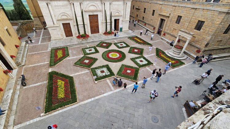 Per quanto riguarda le essenze utilizzate, la scelta è caduta su petunie rosse, gialle e bianche, e su piante di rosmarino, insieme al tappeto di erba naturale; in totale, si sono rese necessarie oltre 2.000 piante, pazientemente allocate dai decoratori. Il risultato è un trionfo di armonia e di colori, che, come detto, caratterizzerà Pienza fino al 18 maggio.