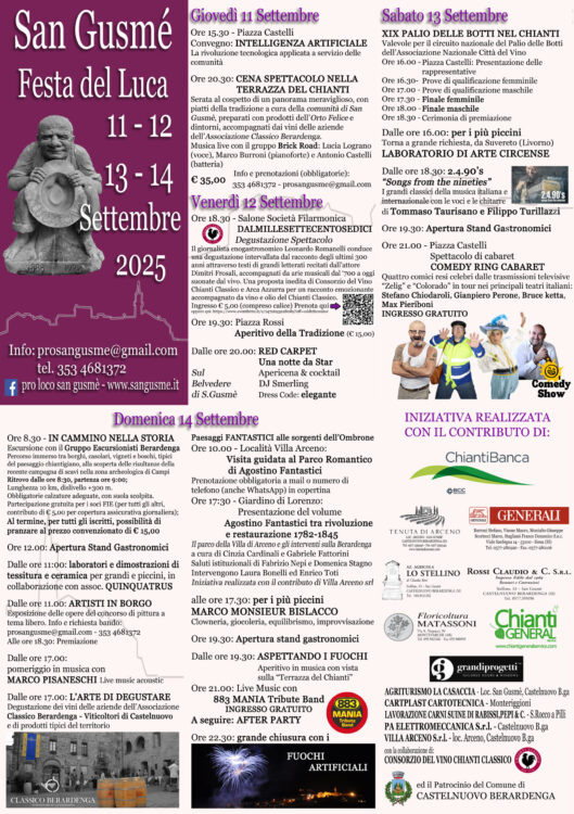 Giovedì 11 settembre la festa si aprirà con il convegno Intelligenza artificiale: la rivoluzione tecnologica a servizio delle comunità (ore 15.30, Piazza Castelli), un momento di confronto tra studiosi, professionisti e istituzioni sul rapporto tra innovazione e comunità locali. La giornata proseguirà con la cena spettacolo nella Terrazza del Chianti (ore 20.30), che unirà la bellezza del panorama a un menù con i prodotti dell’Orto Felice e della comunità di San Gusmè, accompagnati dai vini del Classico Berardenga e dalla musica dal vivo del gruppo Brick Road.