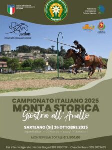 SARTEANO. Sarteano ospiterà nella giornata di domenica 26 ottobre 2025 uno degli appuntamenti più attesi del calendario nazionale degli sport equestri storici: il Campionato Italiano e Trofeo delle Regioni di Monta Storica, organizzato dalla Federazione Italiana Turismo Equestre e Trec – Ante (FITETREC-ANTE), con il patrocinio del CONI e del Comune di Sarteano, in collaborazione con l’Associazione Equestre Avalon.