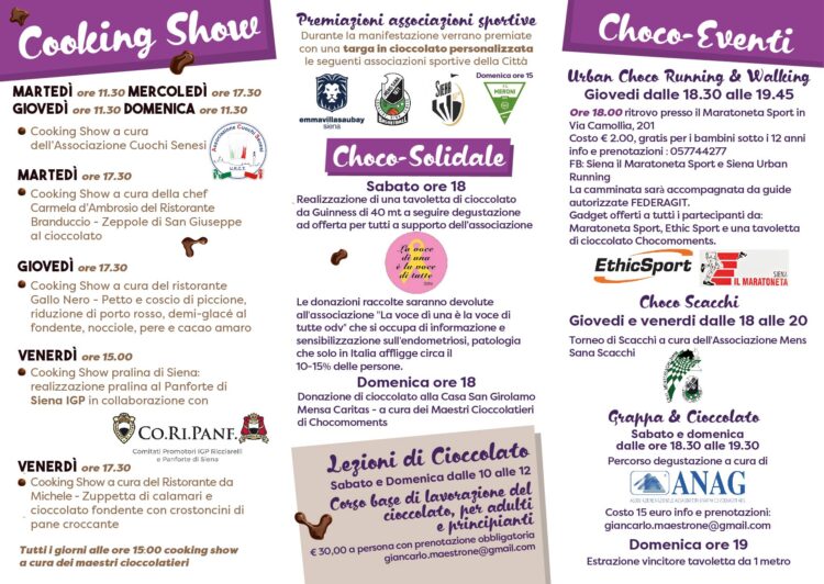 “Tante le realtà che hanno collaborato per dare vita a questa edizione – ha dichiarato Giancarlo Maestrone di Chocomoments – Una conferma del forte interesse che ruota intorno a questa manifestazione. Accanto a veri e propri show culinari in cui l’elemento principe resterà il cacao con ricette che spaziano dalla tradizione senese a quella più all’avanguardia, anche abbinamenti e assaggi di grappa e cioccolato, l’intramontabile corsa urbana per amatori e un torneo di scacchi sotto il segno del choco. Una sfida, da Guinness, con la realizzazione di una tavoletta di 40 metri ma anche appuntamenti tra gusto e solidarietà con una raccolta a supporto dell’associazione ‘La voce di una è la voce di tutte odv’ che si occupa di sensibilizzare e informare sull’endometriosi e una donazione di cioccolato alla casa San Girolamo alla Mensa Caritas. Ma anche premiazioni con speciali targhe in cioccolato alle associazioni sportive della città ”.