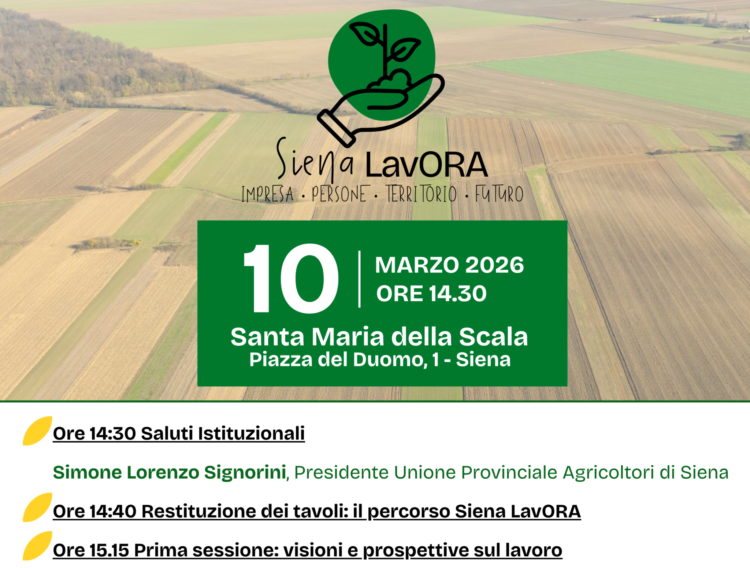 Con questa consapevolezza nasce Siena LavORA, l’iniziativa promossa dall’Unione Provinciale Agricoltori di Siena che il 10 marzo 2026, alle ore 14.30, al Santa Maria della Scala, porterà nel cuore della città un confronto di livello nazionale sul futuro del lavoro in agricoltura.
