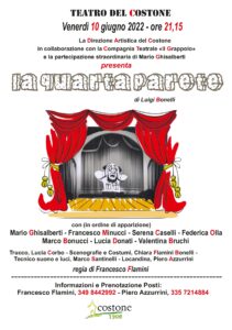 Oltre a questo, ci sarà anche l’occasione per tenere a battesimo la nuova stagione del Teatro del Costone, la cui direzione artistica è stata affidata a Francesco Flamini, figlio della nota Rosanna Bonelli detta Rompicollo, che proprio la sera di venerdì metterà in scena sul palcoscenico del Teatro del Costone, un’opera del nonno Luigi Bonelli dal titolo ‘La quarta parete’, un atto unico che potremmo definire un inedito, per la regia dello stesso Francesco Flamini, con attori senesi molto conosciuti, tra i quali Mario Ghisalberti, Francesco Minucci, Serena Caselli, Federica Olla, Marco Bonucci, Lucia Donati, Valentina Bruchi. Le scenografie e i costumi sono di Chiara Flamini Bonelli, tecnico suono e luci Marco Santinelli, locandina di Piero Azzurrini, un costoniano doc, che tra l’altro affianca Francesco Flamini in questa bella e interessante avventura culturale che ha consentito di accendere nuovamente i riflettori all’interno di un piccolo gioiello di architettura. Gli stucchi che adornano l’interno del Teatro furono curati personalmente da Bettino Marchetti all’inizio del secolo scorso, su commissione dello stesso Orlandi (1911), compreso quello che sovrasta il palcoscenico con la scritta ‘Date Candida Coelo’. Per la prima serata si profila il tutto esaurito in ogni ordine e posto (info: 349 8442992).