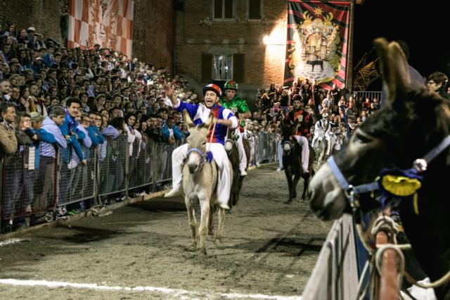 TORRITA DI SIENA. Si è conclusa a notte fonda la sessantesima carriera del Palio dei Somari di Torrita di Siena, in edizione straordinaria per i cinquant’anni della festa, dopo una giornata segnata dal maltempo e dalla pioggia. E le tenebre, rese scintillanti dai fari accessi sul Gioco del Pallone, campo di gara diventato catino incandescente e gremito di folla, hanno regalato un fascino ancora maggiore alla vittoria della contrada de Le Fonti e del suo fantino Michelangelo “Fracassa” Goracci.