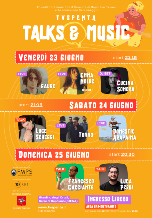 SERRE DI RAPOLANO. Torna ad aprire l’estate della provincia l’Associazione TVSpenta con la programmazione di TVSpenta Talks&Music. Questo fine settimana (23, 24 e 25 giugno) presso i Giardini degli Ortali di Serre di Rapolano salgono sul palco la musica dei giovani artisti toscani e i temi di attualità tra scienza, ambientalismo e comunità queer. Tre serate ad ingresso gratuito grazie ai contributi del Consiglio Regionale toscano e di Fondazione Monte dei Paschi di Siena, in collaborazione con il Comune di Rapolano Terme.