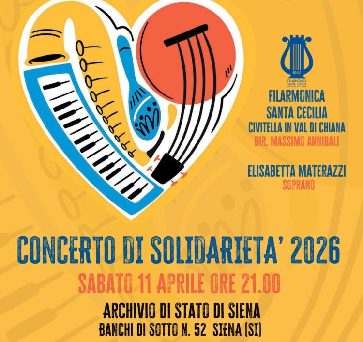 SIENA. Sabato 11 aprile alle 21,00 presso la sala Conferenze dell’Archivio di Stato di Siena, si terrà un “Concerto di Solidarietà 2026”