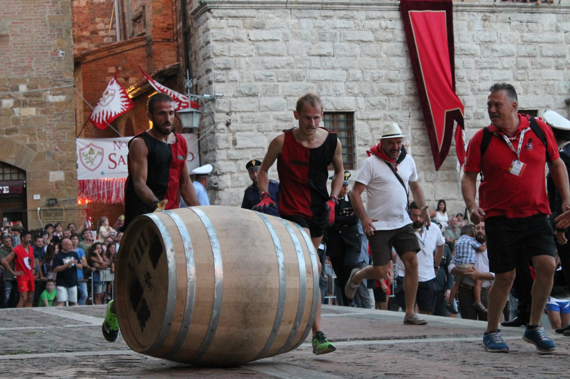 MONTEPULCIANO. Era una delle contrade favorite, ma l’estrazione delle postazioni di partenza l’aveva relegata all’ultima posizione: una partenza difficile che non ha scoraggiato gli spingitori di Voltaia, Attilio Niola (Attila) e Matteo Paganelli (White Kenyan), e che sono arrivati per primi sul sagrato del Duomo.