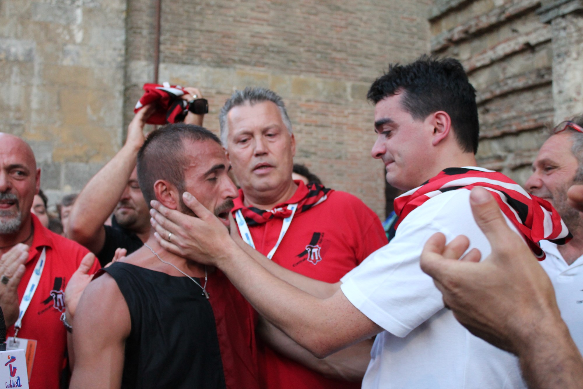 La festa di Voltaia. Attilio Niola e Matteo Paganelli sono stati portati in trionfo dai contradaioli e dal giovane rettore Alessio Bellari. Per “Attila” si tratta della terza vittoria in assoluto, mentre per“White Kenyan” è la prima vittoria. Una vittoria da subito dedicata al “Cica” Giordano Bellari, dirigente di Voltaia prematuramente scomparso nel corso dell’anno.