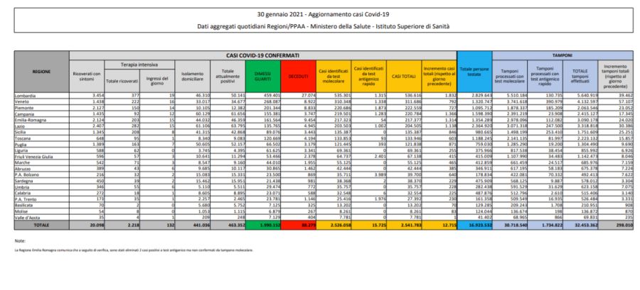 ROMA (ITALPRESS) – Sono 12.715 i nuovi casi di Coronavirus in Italia secondo i dati del Ministero della Salute – Istituto Superiore di Sanità, a fronte di 298.010 tamponi effettuati su un totale di 30.718.540 da inizio emergenza. Nelle ultime 24 ore sono stati 421 i decessi per un totale di 88.279 vittime. Con quelli di oggi diventano 2.541.783 i casi totali di Covid in Italia. Attualmente i positivi sono 463.352 (- 4.472 rispetto a ieri), 441.036 le persone in isolamento domiciliare. I ricoverati in ospedale con sintomi sono 20.098 di cui 2.218 in Terapia Intensiva. I dimessi/guariti sono 1.990.152 con un incremento di 16.764 unità nelle ultime 24 ore. La regione con il maggior numero di nuovi casi è Lombardia (1.832), seguita da Campania (1.366) e Emilia Romagna (1.314).