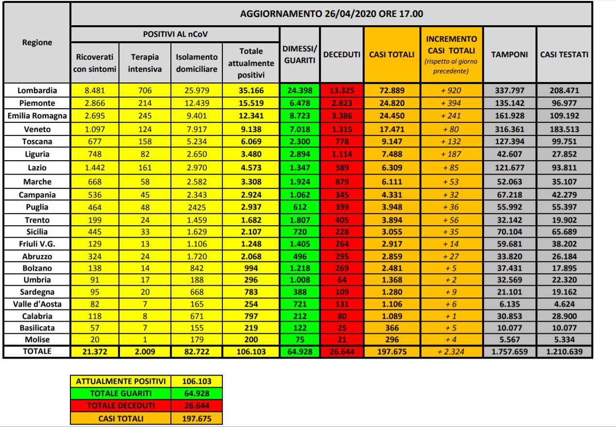 Il numero complessivo dei dimessi e guariti sale invece a 64.928, con un incremento di 1.808 persone rispetto a ieri.