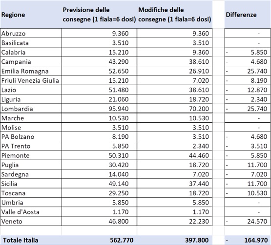 Di seguito la ripartizione delle dosi che verranno consegnate alle Regioni e il confronto con il precedente piano di consegne. Abruzzo: dosi previste 9.360, dosi consegnate 9.360 (invariato). Basilicata: previste 3.510, consegnate 3.510 (invariato). Calabria: previste 15.210, consegnate 9.360 (-5.850). Campania, previste 43.290, consegnate 38.610 (-4.680). Emilia-Romagna, previste 52.650, consegnate 26.910 (-25.740). Friuli-Venezia-Giulia, previste 15.210, consegnate 7.020 (-8.190). Lazio, previste 51.480, consegnate 38.610 (-12.870). Liguria, previste 21.060, consegnate 18.720, (-2.340). Lombardia, previste 95.940, consegnate 70.200 (-25.740). Marche, previste 10.530, consegnate 10.530 (invariato). Molise, previste 3.510, consegnate 3.510, invariato. Provincia Bolzano, previste 8.190, consegnate 3.510(-4.680). Provincia Trento, previste 5.850, consegnate 2.340 (-3.510). Piemonte, previste 50.310, consegnate 44.460 (-5.850). Puglia, previste 30.420, consegnate 18.720 (-11.700). Sardegna, previste 14.040, consegnate 7.020(-7.020). Sicilia, previste 49.140, consegnate 37.440 (-11.700). Toscana, previste 29.250, consegnate 18.720 (-10.530). Umbria, previste 5.850, consegnate 5.850 (invariato). Valle d'Aosta, previste 1.170, consegnate 1.170 (invariato). Veneto, previste 46.800, consegnate 22.230 (-24.570).