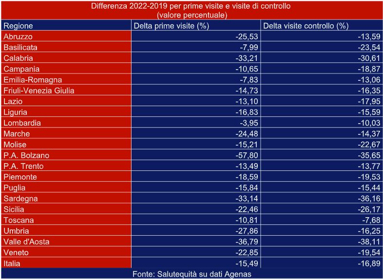 Analizzando i dati in termini percentuali per rendere meglio l'idea della differenza tra 2022 e 2019, meglio rispetto alla media nazionale Campania (-1,19%), Lazio (-4,77%), Lombardia (-4,79%), Basilicata (-5,98%). Mancano invece all'appello oltre una prestazione su 5 in Calabria (-20,51%), Sardegna (-21,27%), Valle d'Aosta (-32,55%), P.A. Bolzano (-45,34%).