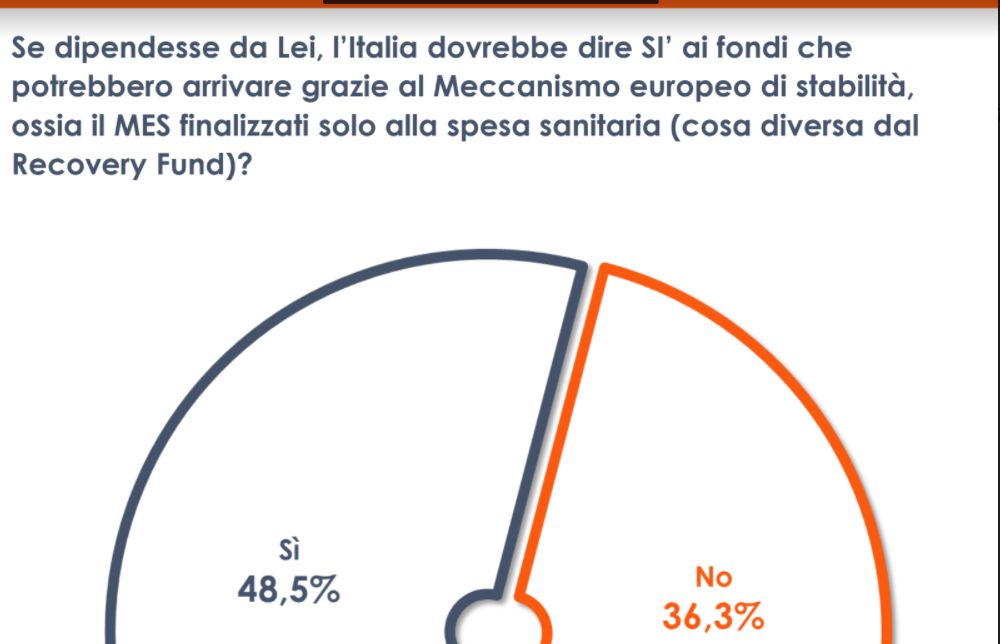 ROMA (ITALPRESS) – La pandemia che ha colpito il nostro Paese – e il Mondo intero – ha creato non pochi problemi anche da un punto di vista economico. Difficoltà che rischiano di diventare ancora più gravi con la seconda ondata di contagi. Si discute, quindi, da tempo, delle misure da attuare per affrontare la crisi e delle valutazioni su MES e Recovery Fund. In questo contesto, dunque, quasi la metà degli italiani si dichiara favorevole all'accettazione del MES (48,5%), in modo particolare se finalizzato alla sola spesa sanitaria, mentre il Recovery Fund potrebbe rappresentare per il 40,2% un primo passo per un vera ripresa economica del Paese. È quanto risulta da un sondaggio di Euromedia Research.