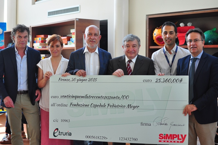 FIRENZE. . Simply Etruria, master franchisee di Simply® Italia, sostiene il progetto “Accoglienza bambini” della Fondazione dell’Ospedale Pediatrico Meyer di Firenze. Grazie alla generosità dei clienti Simply, che hanno deciso di destinare i punti della Collection 2014 per sostenere le attività del Meyer, la Cooperativa di Badesse ha consegnato oggi, martedì 30 giugno, oltre venticinque mila euro a favore dei progetti e delle attività dedicate ai piccoli ospiti dell’Ospedale Pediatrico di Firenze. Alla cerimonia di consegna dell’assegno hanno partecipato Graziano Costantini, direttore generale Cooperativa Etruria e Gianpaolo Donzelli, Presidente della Fondazione dell’Ospedale Pediatrico Meyer di Firenze.