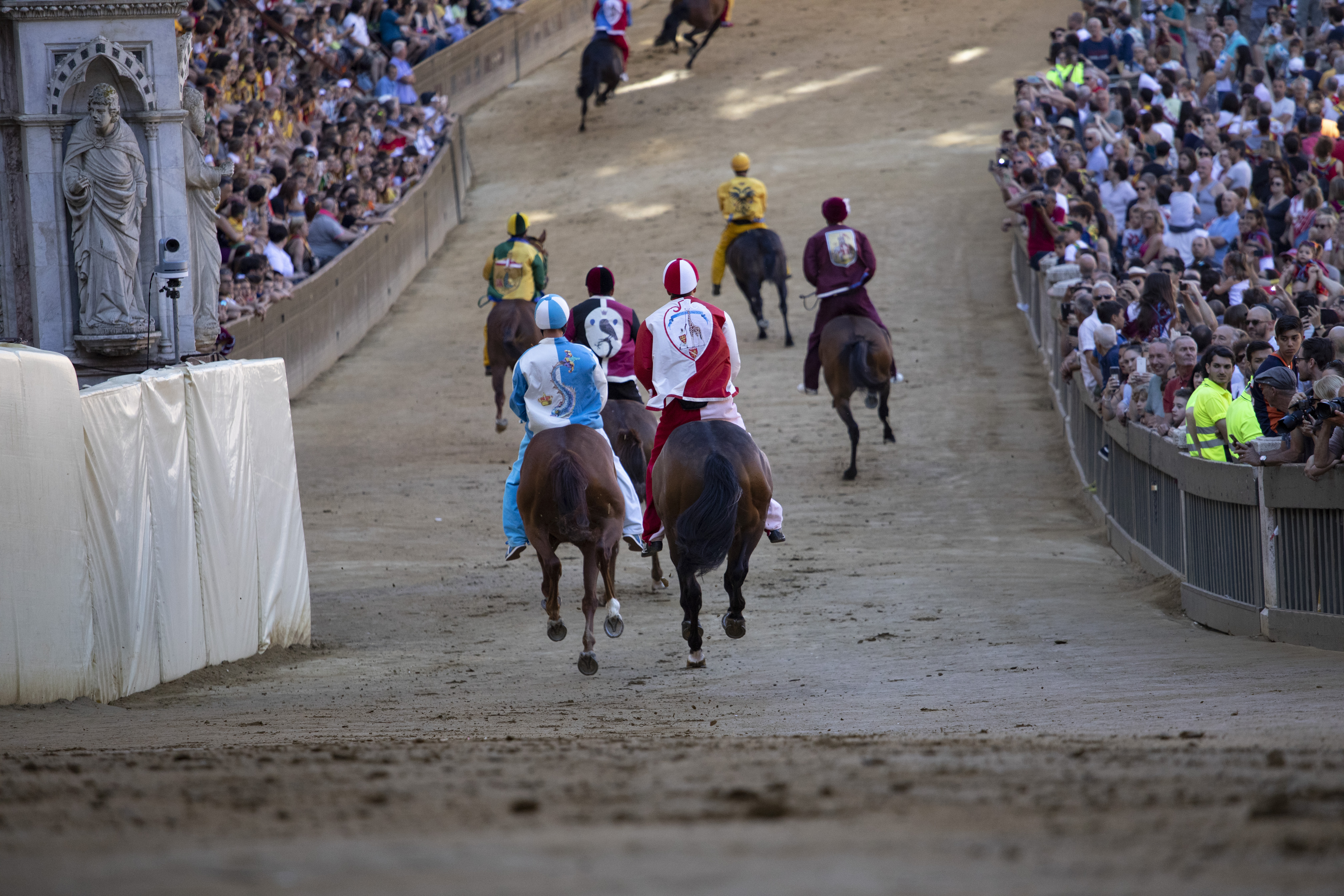 SIENA. Si pate con l’ordine inverso, ripsetto a ieri, e cioé Drago, Chiocciola, Giraffa, Pantera, Aquila, Civetta, Torre, Bruco, Selva e Onda di rincorsa. Cavalli in grande agitazione tra i canapi, ma alla fine con un allinemento accettabile l’Onda scatta all’interno ed è il Drago a prendere la testa con un buon tempo di galoppo, che mantiene per quasi due giri, per poi rallentare ma mantenendo la testa fino allo scoppio del mortaretto.