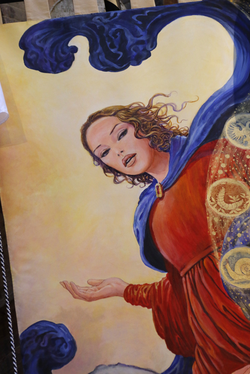 E’ Vincenzo Mollica, l’autore dell’introduzione allo splendido catalogo della mostra senese, che ci introduce anche a questo drappellone con una frase che ha il senso di una oculata predizione. Alludendo alle bellissime donne di Manara, Mollica scrisse: Manara oggi dipinge delle Maddalene, mentre sarebbe un intenso e dolcissimo pittore di Madonne. Ed eccolo Milo Manara, oggi, ancora a Siena, mostrarsi intenso e dolcissimo pittore di una celeste Regina intensa e dolcissima.