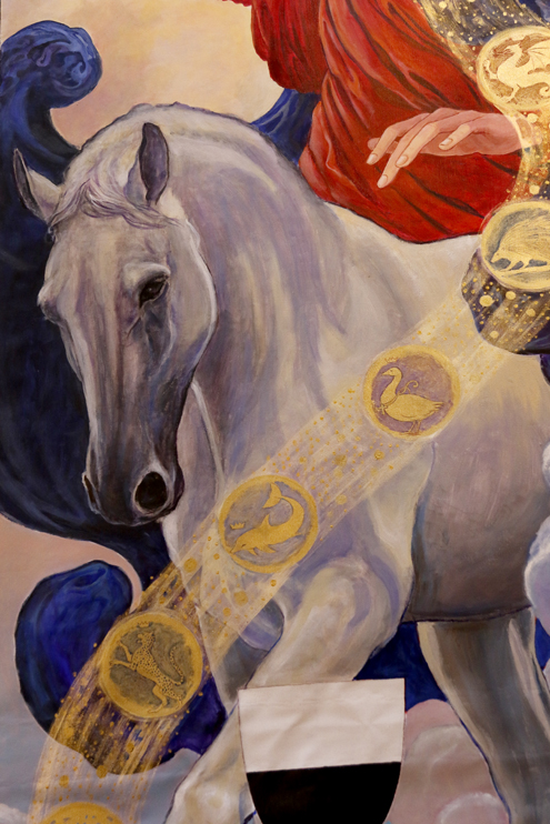 Il movimento e la postura delle mani è semplicemente incantevole. La destra, con il palmo rivolto verso l’alto è un chiaro messaggio simbolico che rimanda al mistero dell’Opera divina, che vede la Madonna generare il figlio di Dio nel candore. La mano sinistra, invece, sfiora un magnifico destriero bianco, simbolo del Palio. Un accenno di tenera carezza verso l’unico vero protagonista della corsa che, al contempo, rappresenta l’intera collettività senese e la forza della sua identità.