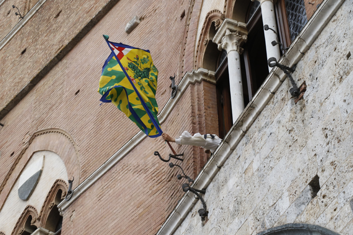 Alle trifore del secondo piano di Palazzo Pubblico sono state esposte le bandiere di: Leocorno, Pantera, Civetta, Drago, Tartuca, Nicchio e Giraffa.