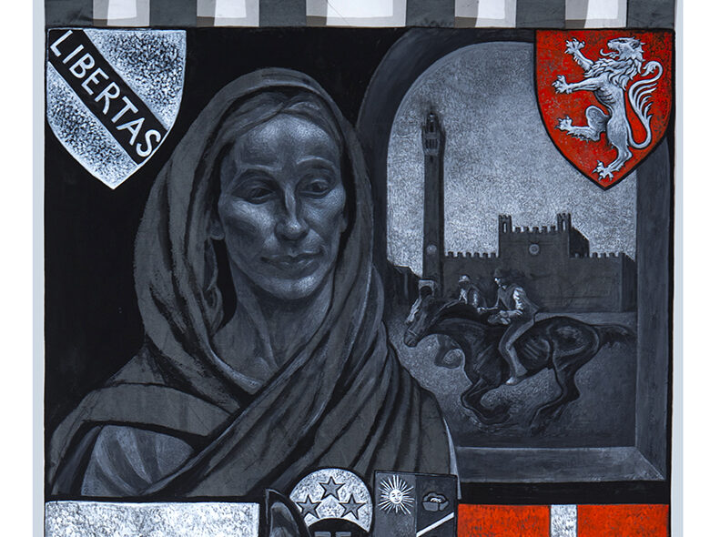 Ogni dipinto che rappresenti il volto di una donna, è anche un’opera che racconta il momento storico, la storia dell’arte, lo stile dell’autore e che permette di fare riflessioni, confronti, accostamenti e critiche. In particolare, parlare dei volti delle Madonne, significa parlare di molte cose insieme, soprattutto a Siena. La Madonna è mistero, bellezza, simbolo, unicità, immaterialità e materialità. Riuscire a condensare tutte queste caratteristiche non è operazione di poco conto, la Sergeant ci è riuscita ed ha connotato l’immagine della Vergine di carnalità illuminandola anche di mistero e intensità. Il Sindaco di Siena ha accostato il volto della Madonna a quello della madre di Pasolini, Susanna Maria Colussi, ma anche a quello della stessa artista, Balestracci ha esposto le caratteristiche fondamentali dell’opera che a mio avviso é più scultorea che pittorica. Il volto della Madre di Cristo evoca fortemente quello della Pietà di Michelangelo ed i chiaroscuri utilizzato dall’artista sembrano scolpirlo con grande intensità più che dipingerlo, facendo emergere l’anima della nostra città che per due lunghissimi anni ha sofferto la mancanza della sua festa più bella. Non solo scultura nel drappellone della Sergeant, ma anche grafica. Al di là dei significati non di poco conto dei due colori accostati; energia e passione con l’unione di giallo e rosso a formare un arancio intenso, mistero con il nero, l’insieme evoca molto anche i colori del graphic design, di un elegante grande manifesto che rappresenta la carriera di questo infuocato luglio 2022. La Madonna ci accompagna e, pur essendo distante da noi, è con noi e vive la tradizione senese accanto alle architetture uniche di Piazza del Campo abitata dal rumore degli zoccoli dei cavalli e dal fumo che esce dalle loro narici. Ogni oggetto visibile diviene anche invisibile, connotato di simbolismi ed essenzialità ed é una vertigine abbandonarsi alle suggestioni del drappellone fra il volto della Vergine e la Piazza avvolta da una stupefacente magia.