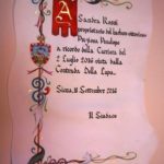 SIENA. Siena e le Contrade rinnovano il legame con il Liceo Artistico Statale “Duccio di Buoninsegna”. Sono infatti studentesse della scuola le autrici dei bandierini, e delle pergamene, donati alla proprietaria di Preziosa Penelope, la cavalla vincitrice delle carriere del 2 luglio e del 16 agosto. Vanessa Casini e Stella Sampieri hanno realizzato i bandierini; la pergamena del Palio di agosto è opera di Eleonora Cresti, mentre quella di luglio è stata realizzata da Erika Di Milia. Rebecca Arzilli, invece, è l’autrice della pergamena in ricordo della vittoria del Masgalano, conquistato dalla Contrada Sovrana dell’Istrice.