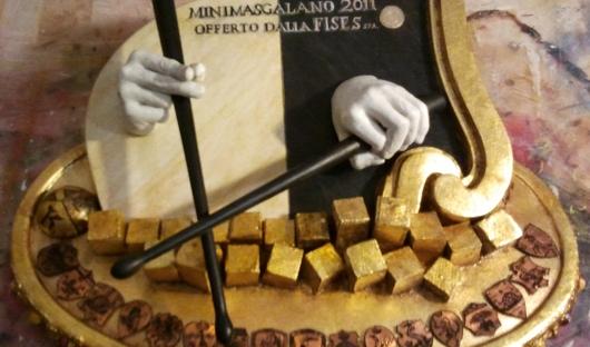 “Vorrei innanzitutto ringraziare la FISES – spiega l’artista Tommaso Andreini – che mi ha dato la possibilità di realizzare questa scultura per me ragione di orgoglio e di intenso stimolo. Un’opera che costituisce ormai da molti anni, al di là dell’essere un premio o un obiettivo, un simbolo importante del vivere la Contrada e le tradizioni, del sentire più genuino e autentico, quello dei nostri giovani alfieri e tamburini. Da qui l’idea di utilizzare i barberini, collocati di fronte agli stemmi araldici delle 17 contrade cesellate in rame ed applicate in rilievo. Ho creato un bassorilievo in gesso alabastrino, con parti poliedriche che, in maniera molto stilizzata, stanno a rappresentare i palazzi e le torri senesi. Tutto ciò ricoperto da oro in foglia, applicato con le tecniche ed i procedimenti originari e rigorosi. Anche le due mani che stringolo le mazze, sono in gesso e sono trattate come allora, con latte e borotalco. Il mio e’ un omaggio a Siena, un tributo fatto di foglie d’oro, dalla balzana in finto marmo, dalla cura del bassorilievo e dall’immagine delle due mani di bambino che sembrano suonare armoniosamente il tamburo, a riproporre un ritmo che scandisce il tempo dalla nostra secolare Festa e dalle nostre uniche emozioni”.
